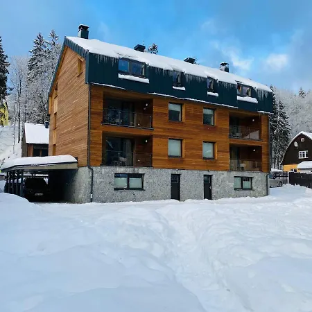 O apartamento Apartmány Hromovka está localizado a 1 km do centro de Špindlerŭv Mlýn e oferece acomodação com estacionamento no local. Situado bem perto de Teleférico de Hromovka, este apartamento de 7 quartos irá surpreendê-lo com parque aquático e área de piquenique.